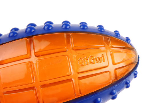 Gigwi Push to Mute Rugby Ball Optional Squeaky TPR Toy for Dogs - Blue Orange