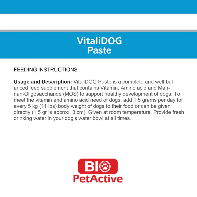Methionine; Helps protect kidney, fur and skin. Niacinamide; It helps release energy into your dog’s cells while lowering cholesterol levels of your dog. Vitamin A; Strengthens eyesight and helps to reduce dryness, sclerosis and itchiness that may occur on skin of our four-legged friends, and helps to keep the skin and coat healthy.Ca-D-Pantothenate; is an anti-stress vitamin. Our lovely friends can’t fight infections if they don’t get a sufficient amount of Vitamin B5.Vitamin B2; It helps to produce energy from fat and contributes to the quality of skin and fur.VitaliDOG Paste contains L-Carnitine to help reduce the proportion of fat in the body; and Biotin to help fight against shedding.