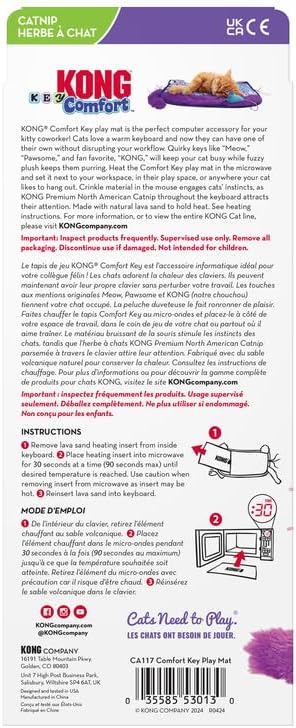 • KONG Comfort Key play mat gives your kitty coworker a warm keyboard of their own! Filled with enticing crinkle material, catnip, and natural lava sand to hold in heat, your cat can snuggle and play next to you without disrupting your workflow.