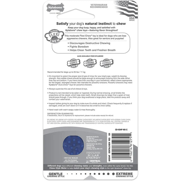 Polish your canine companion’s pearly whites without her even knowing it with the Nylabone Flexible Dental Chew Bone Dog Toy. This nubby toy has rounded bristles and nubs that work to clean the teeth, stimulate gums, remove plaque and tartar, and freshen her breath while she satisfies her urge to chew. Dental Chews are a great alternative to chewing up the couch cushion, and recommended by vets!